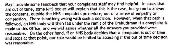 Ombudsman legislation states that the complainant must approach the Ombudsman within twelve months of first knowledge that something was wrong. That is an arbitrary date which should be changed to 12 months from final closedown of initial complaint. Although the complainant may give a date that they were first aware it has been known for the Ombudsman to disagree and consider a different date to be the most likely and use that to invalidate the complaint. PHSO also give advice to public bodies on using ‘time out’ procedures as you can see here.