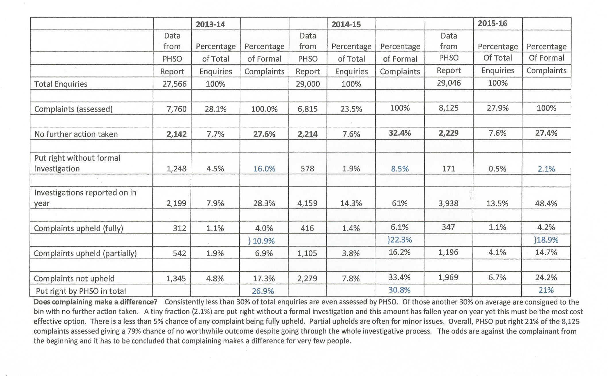 In 2015/16 PHSO received 6,323 parliamentary complaints. Of these, just 649 (10.2%) were investigated and a minuscule 279 (4.4%) upheld to some degree. Once again over 95% of the people who took the time and trouble to pursue a complaint over many months or years did so for no good reason. Just time wasters with nothing better to do than write letters and moan.