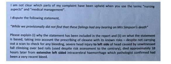 So it seems she was so unwell it was OK to discharge her!!? The Trust actually acknowledged the discharge was inappropriate and apologised and arranged for a review of discharge procedures but this was ignored by the PHSO in their desire not to uphold the complaint.
