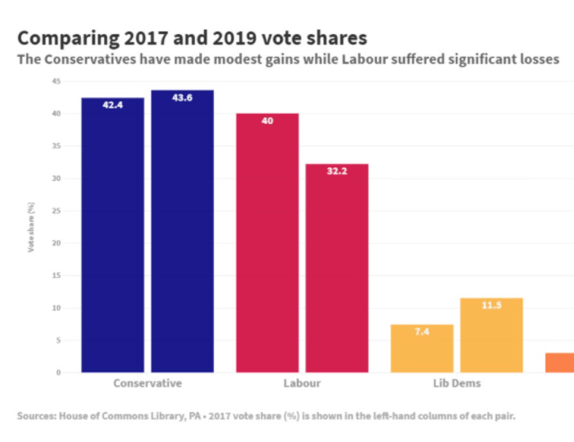 Once Labour backed a second referendum they became the only party who could actually stop Brexit and their policy of renegotiation would in any event lead to a much softer deal with access to the customs union and single market. This was the best deal in town for remain voters, consequently, they needed to be tempted away from voting Labour by tactically voting for the Lib Dems who, it was promised, would hold the balance of power and secure a second referendum from a minority Conservative government. Labour lost over 2 million votes in the 2019 election and the majority of them went to the Lib Dem remain option. If we consider that both Conservative and Lib Dem gains came primarily from Labour then approximately 300,000 votes were lost to the Conservatives while a whopping 1,300,000 were lost to the Lib Dems.