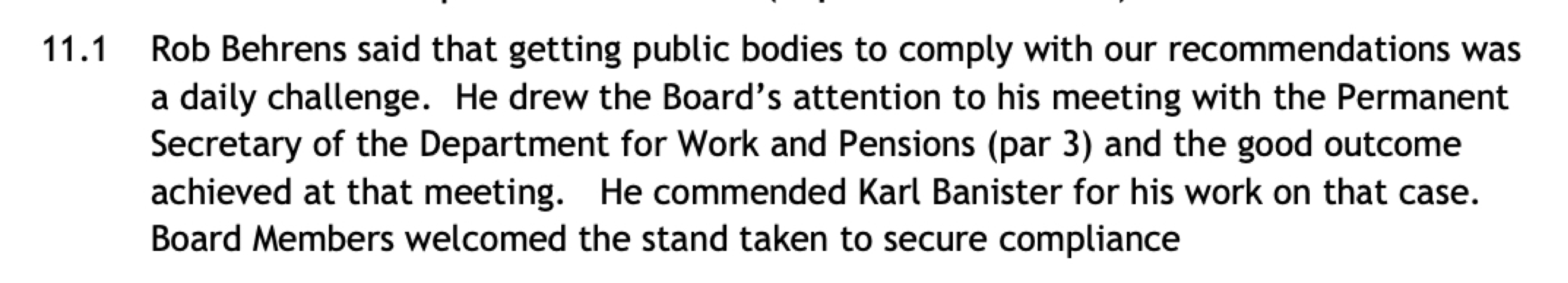 The sticking point for PHSO was ensuring compliance, given that it has no powers to compel a public body to abide by its findings. As Rob Behrens stated, PHSO could not risk another unsuccessful judicial review, hence the ‘independent’ and ‘impartial’ process required endless negotiation with the public body under investigation. This was finally resolved by Karl Banister from the PHSO legal team, as recorded in the October 2019 board minutes.