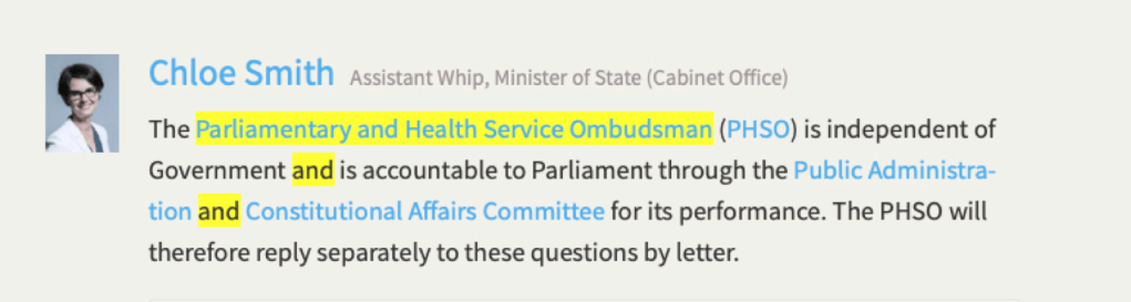 And Michael Gove at the Cabinet Office has been asked for an assessment of the adequacy of the Parliamentary Ombudsman and Chloe Smith, answering on his behalf, says that the PHSO will answer that question itself! Is this Yes Minister? I can’t imagine there will be any conflict of interest in the reply and that the PHSO will provide an honest assessment of its failings. How would anyone answer if they were asked to give an assessment of the adequacy of their own performance?