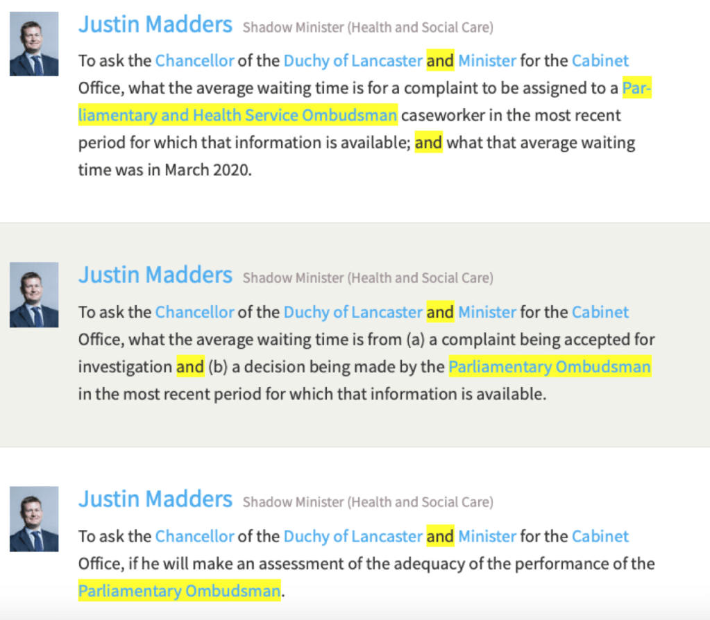 On the 18th March 2021 Justin Madders, Shadow Minister for Health and Social Care asked the Duchy of Lancaster (Michael Gove) some very searching questions regarding PHSO performance.