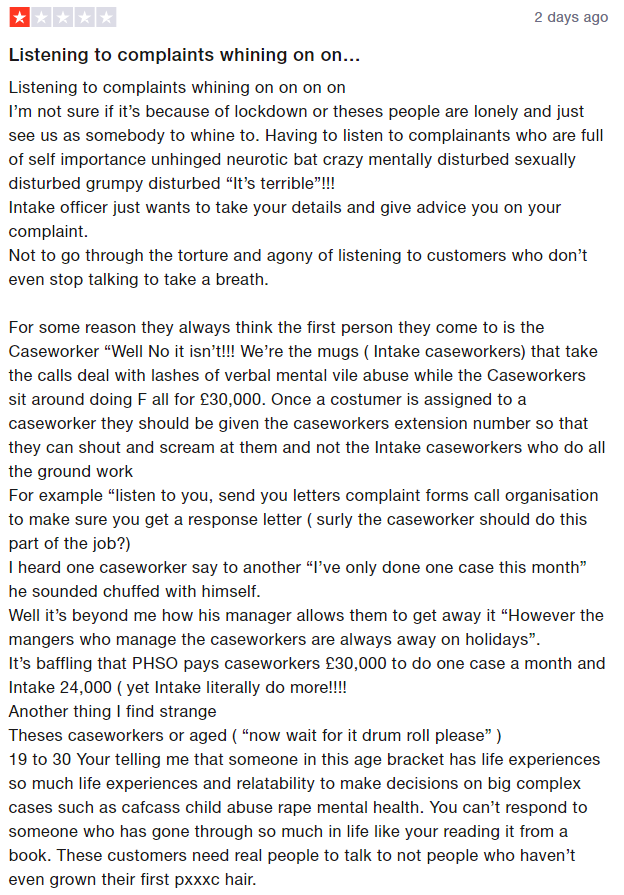 Star’s review appears to be based on genuine experience, certainly it rings true to any users of PHSO. It’s not advertising or promotional – no the very opposite in fact. It doesn’t contain personal information so it must have been removed on the basis that the comments were ‘harmful’ or ‘illegal’. There was certainly an element of ‘hate speech’ as Star first attacked the ‘unhinged’ complainants and then their ‘lazy’ caseworker colleagues. Defamation was the most likely reason for the censorship.