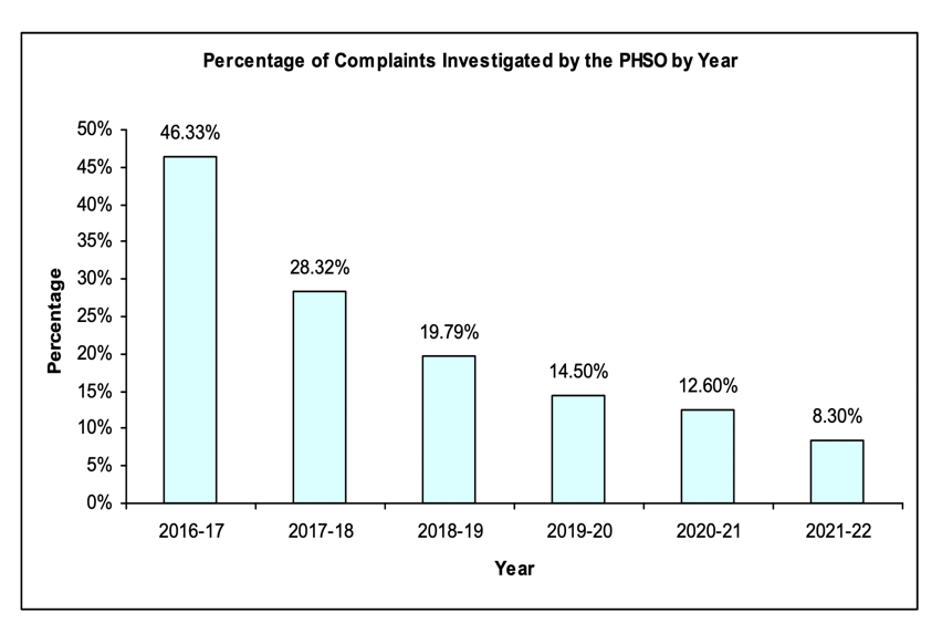 In 2016-17 about 46% of all complaints made to the PHSO were investigated. In 2021-22 only about 8% of all complaints were investigated.