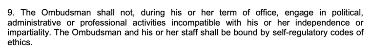 “The Ombudsman shall not, during his or her term of office, engage in political, administrative or professional activities incompatible with his or her independence or impartiality”.