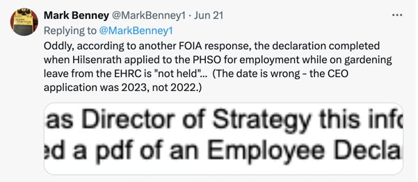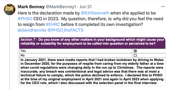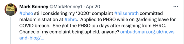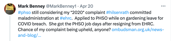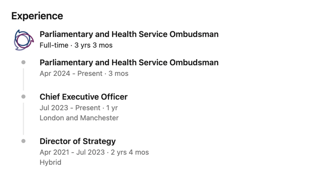 By April 2021, prior to the findings of the investigation, Hilsenrath resigned from EHRC and walked straight into the job of Director of Strategy at PHSO. She became CEO by July 2023 and in April 2024 took on the top job of Ombudsman (interim). Her rapid rise is documented on her LinkedIn profile.