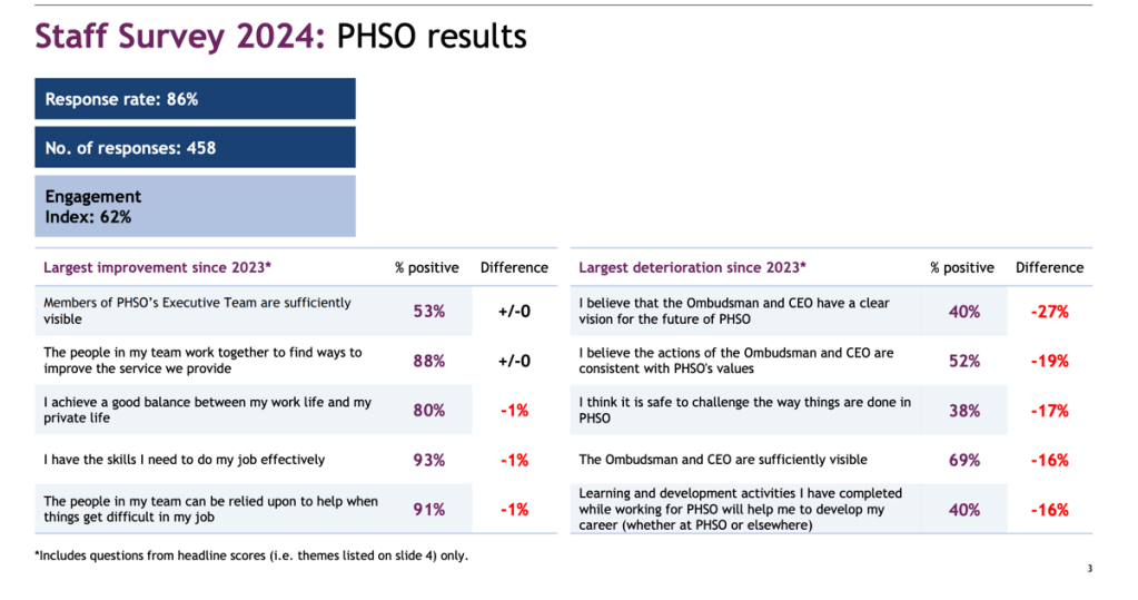 The PHSO Staff Survey taken in November 2024 is now available on the PHSO website and it makes for dismal reading for the senior management of the organisation, specifically Rebecca Hilsenrath, the Acting Ombudsman at the time, and the temporary CEO Gill Kilpatrick.