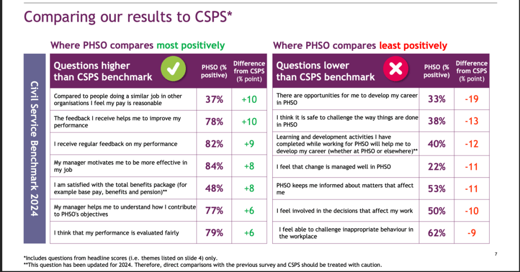 The PHSO Staff Survey shows that staff in November 2024 were happy with their managers and team but dissatisfied with leadership and career opportunities. No doubt this is partly down to the disruption of the past 12 months after Rob Behrens left the organisation after 7 years in post and the Prime Minister, controversially and against protocol and precedent, vetoed his highly qualified successor, Nick Hardwick, chosen by Parliament.