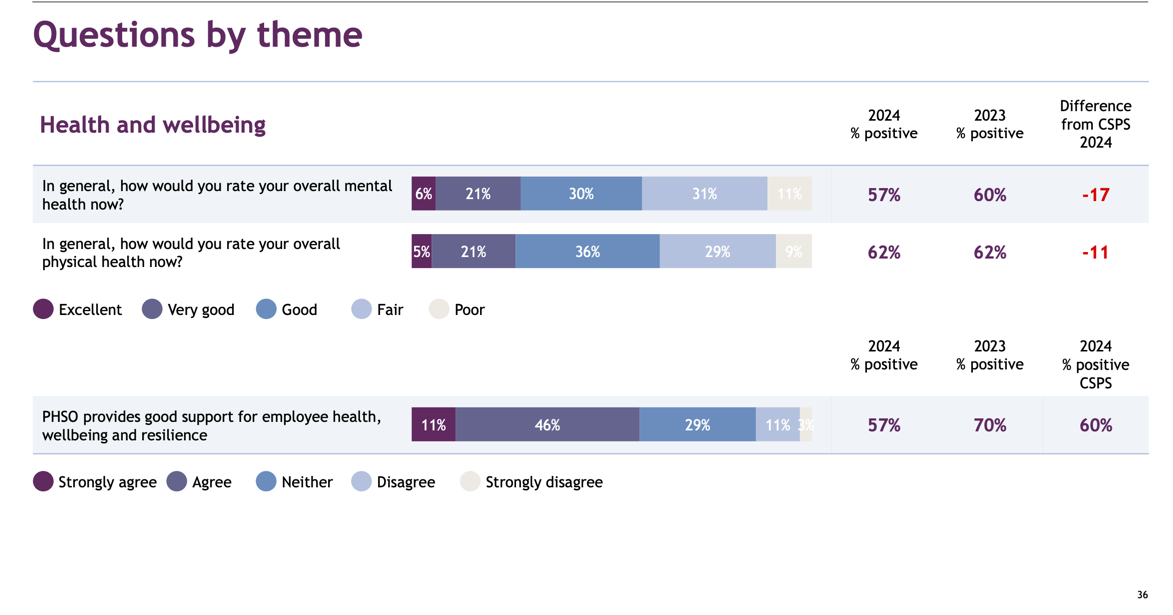 Perhaps of most concern is the low level of mental and physical health reported in the survey. Only 57% of staff at the PHSO felt positively about their mental health compared with 74% of staff surveyed in the Civil Service People Survey. Similarly, only 62% were positive about their physical health compared with 73% in the CSPS. It must be of concern that a member of the public contacting the PHSO regarding a complaint has a good chance of interacting with a member of staff who feels negatively about their own mental health.