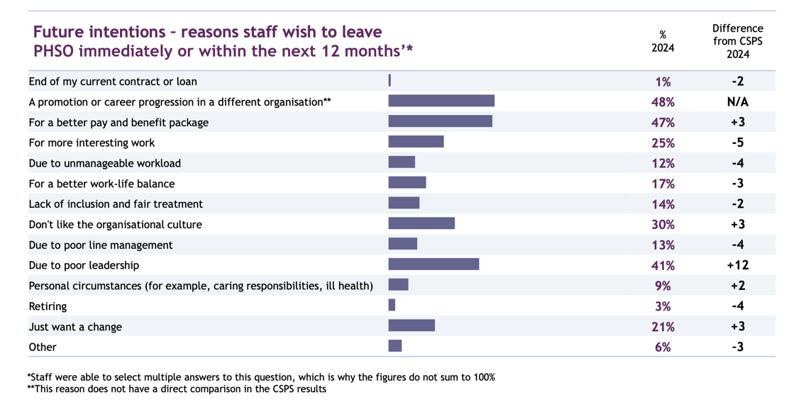 Finally, page 39 of the survey reveals that 23% of PHSO staff want to leave the PHSO as soon as possible or within the next 12 months. Of these 41% said that their decision was entirely or partly due to poor leadership at the PHSO.