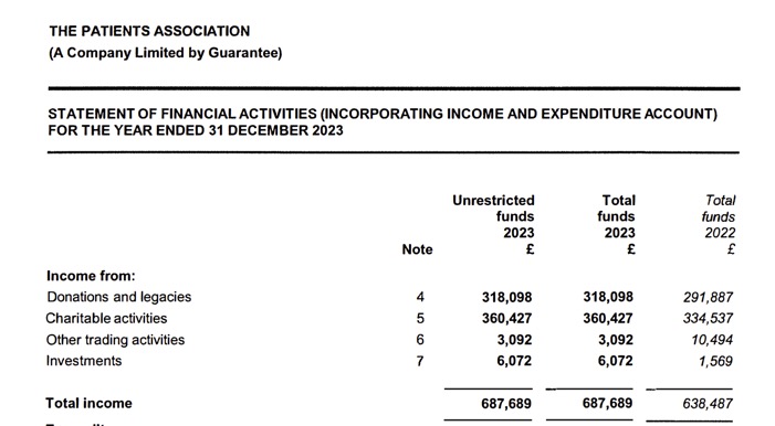 Although the Patients Association state that they are “…an independent registered charity that offers support and advice to patients,” they do not raise the majority of their funds from the public. According to the 2022/23 Charity Commission Register (p22), the bulk of their funding comes from ‘Corporate donations/membership’.