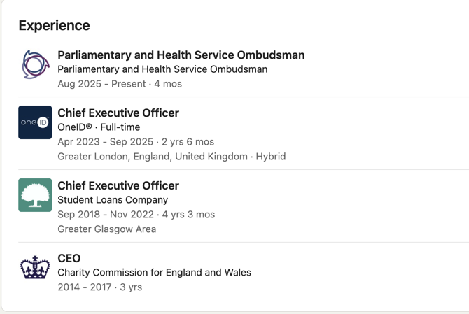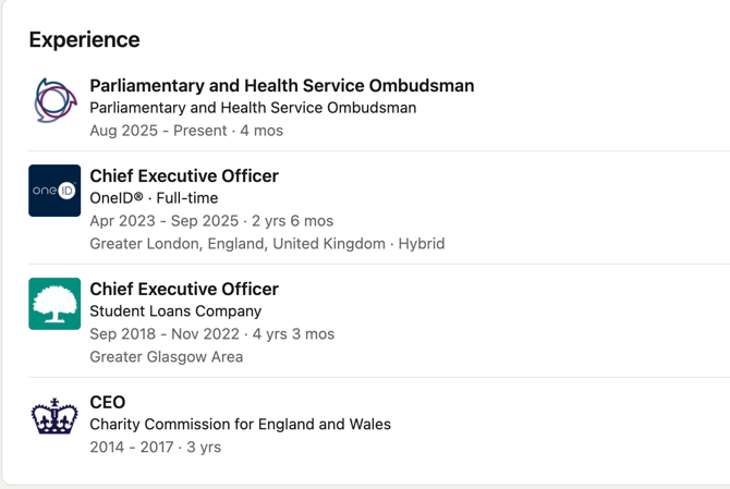We can see from her LinkedIn profile that she was the CEO of the Charity Commission between 2014 and 2017. In March 2024, PHSO issued two damning reports into the Charity Commission regarding serious safeguarding issues of sexual exploitation and child sex abuse at two separate charities. The Commission refused to comply, then issued legal proceedings to prevent the reports from being laid before parliament. Although both complaints, that of Mr U and that of Miss A, were submitted after Sussex left the organisation (in 2018 and 2019, respectively), they were ‘handled badly’ under the framework and culture left by her leadership. Quite a legacy of making things better.
