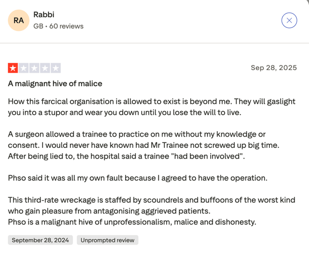 If she really wants to get a window onto the world of the customers that she ‘serves’, then she needs to step out of that bubble and get into the real world. Perhaps when she puts that pen down, she could take a look at the PHSO TrustPilot reviews. This one sums it up nicely.