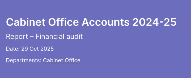 Three months later, in October 2025, an audit of the Cabinet Office Accounts is qualified by the Comptroller and Auditor General due to, among other things, delays with the Infected Blood Compensation Scheme.,