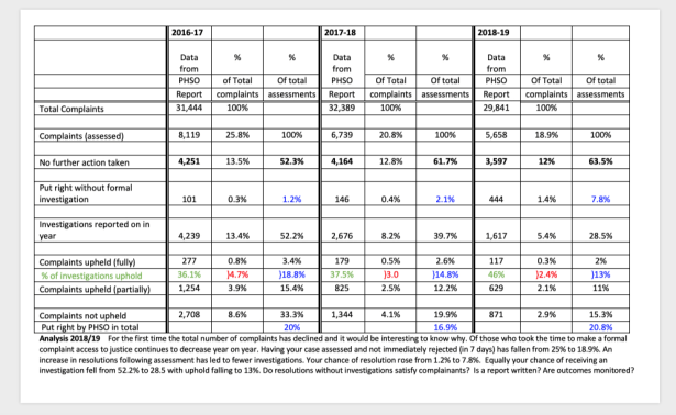 As part of their new complaint handling process PHSO are resolving more complaints without a formal investigation. They call this ‘the right decision at the right time’. The number of formal investigations has dropped under Rob Behrens who became the Ombudsman in April 2017. In 2018/19 just 2.4% of all the complaints were upheld to some degree following an investigation a figure which rises to 20.8% when resolutions without investigation are taken into account. Many people are disappointed with the outcome as the most serious aspects of their complaint tend to be the ones which are not upheld.
